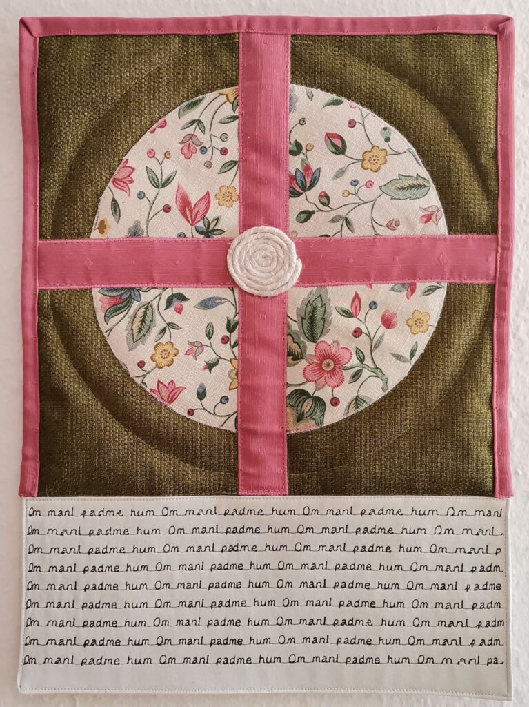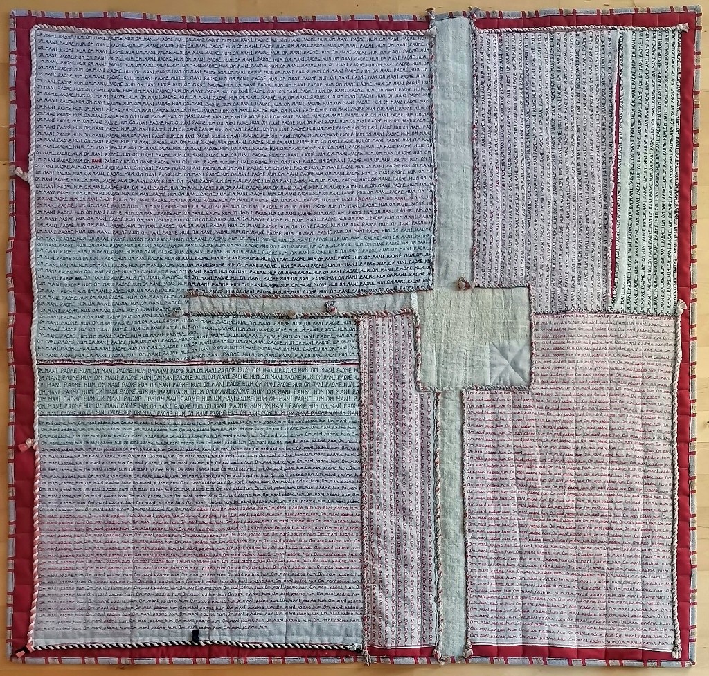 Für die Ausstellung *8 Milliarden* (in der Berchtoldvilla in Salzburg), gefertigter Meditationsteppich, den ich mit unzähligen Wiederholungen des Mantras OM MANI PADME HUM bestickt und gequiltet habe.