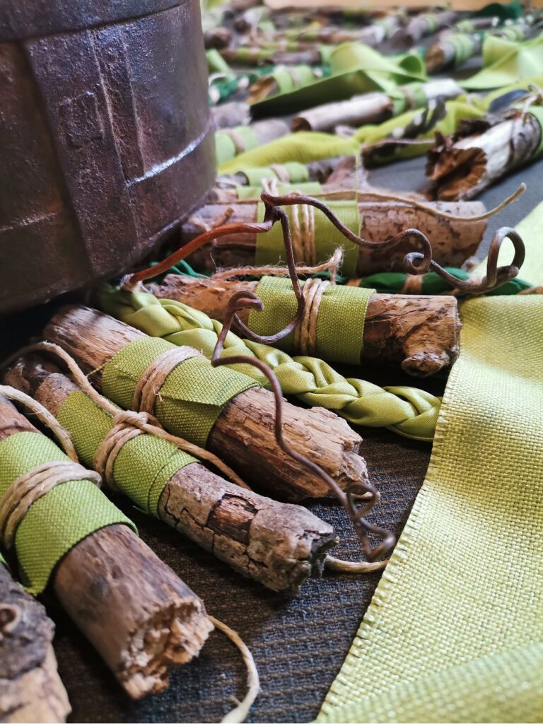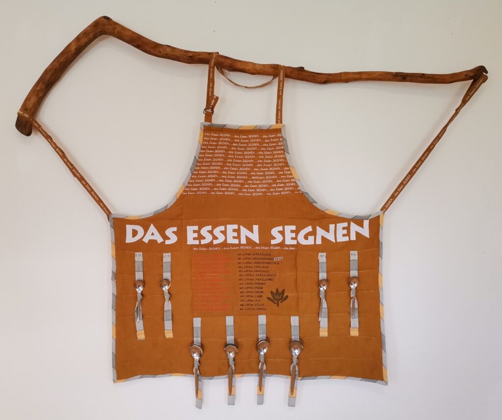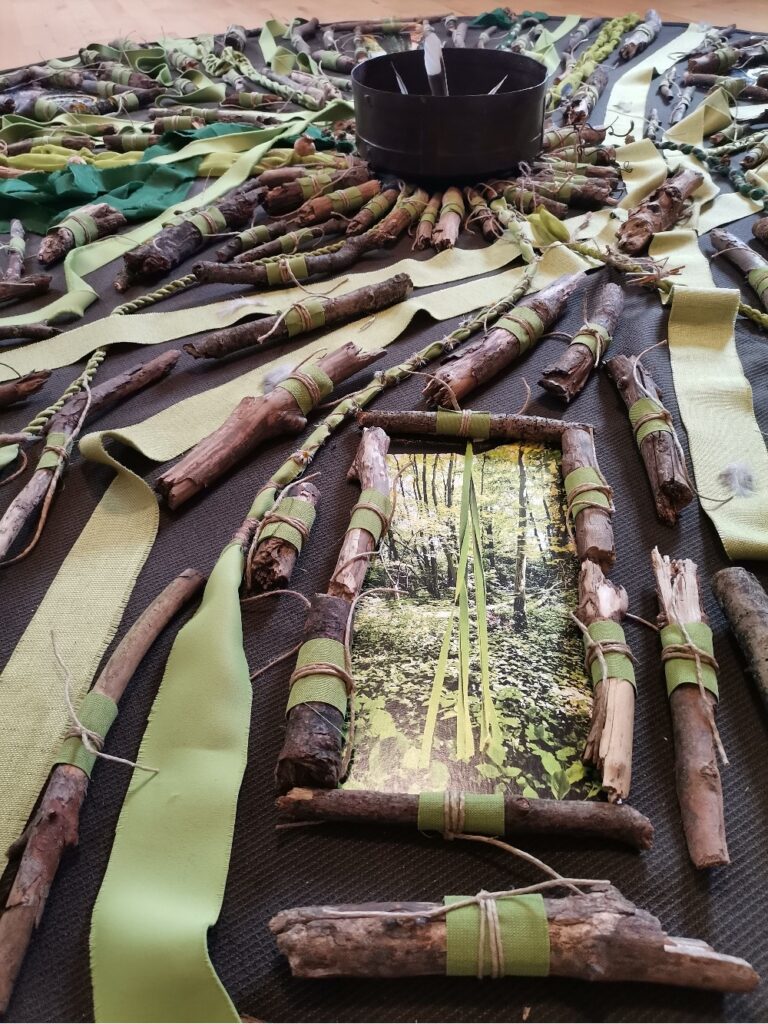 Mittig auf dem erdfarbenen Tuch steht ein Kessel mit Asche und drei Federn als Symbol der Erneuerung und Phönix-Kraft unserer Erde. Die Segensbänder sind sowohl in Form von Fotografien – als auch am Erdtuch liegend – Teil der Installation. Sie sind geflochten, geknotet oder gezwirbelt und geschmückt mit Naturmaterialien. Dazwischen ist Klaubholz ausgelegt, das mit Stoffstreifen umwickelt ist.