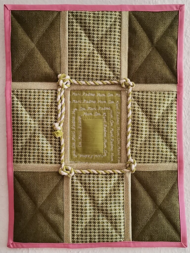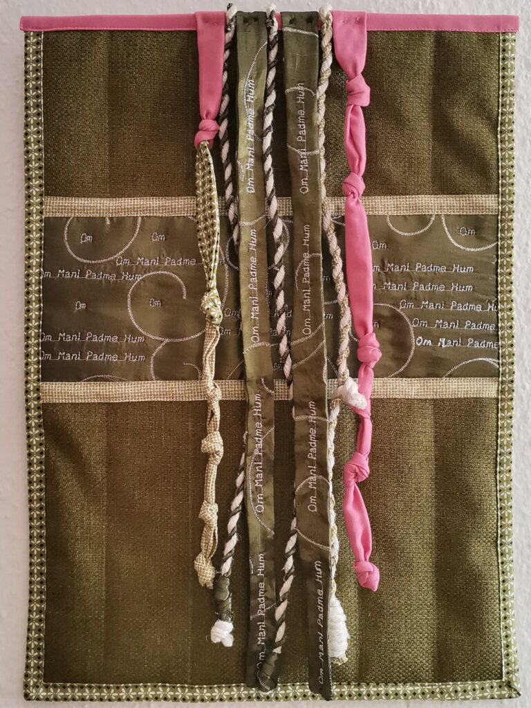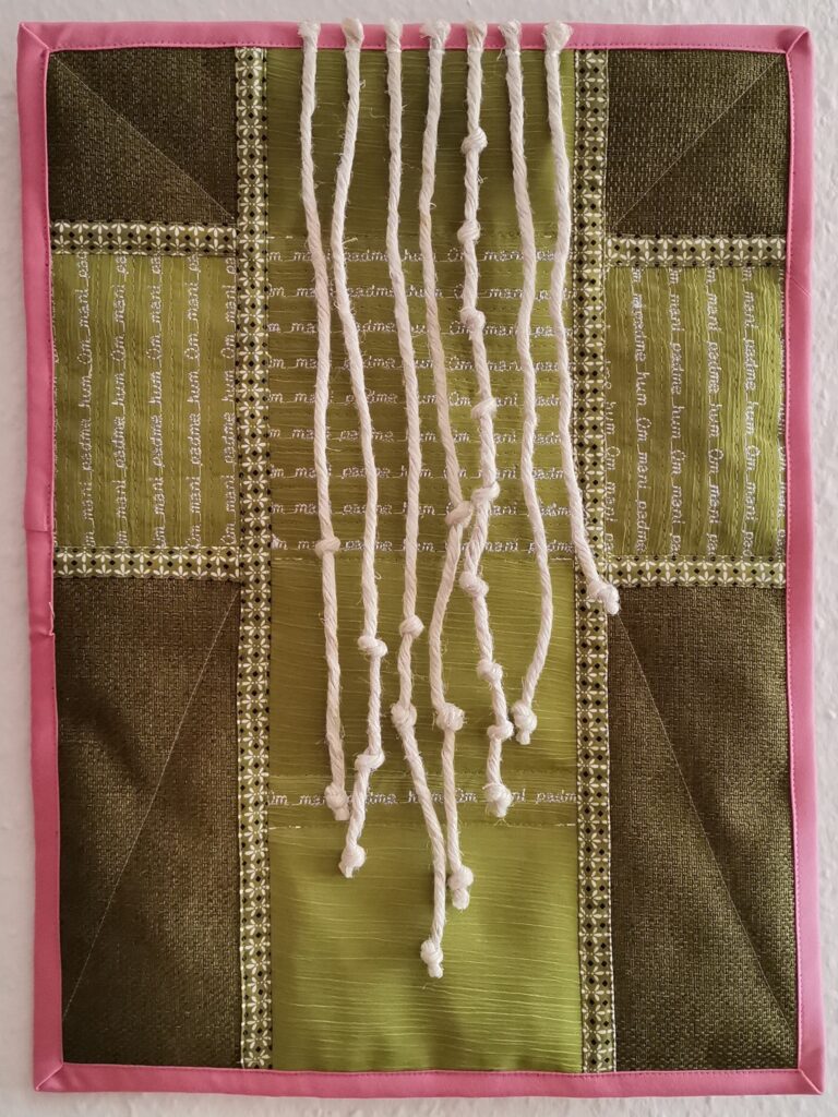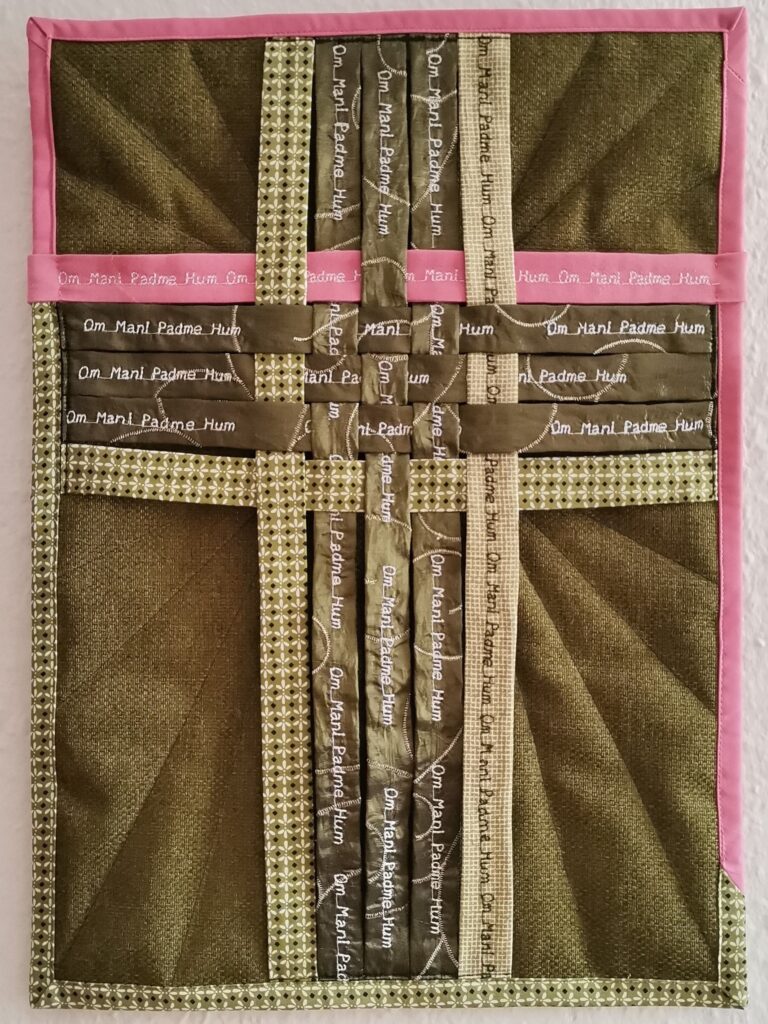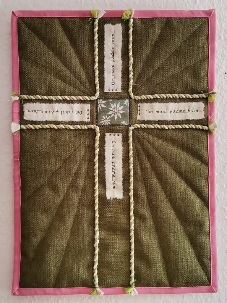 Eine kleine Serie textiler Arbeiten, bei denen ich stets das Kreuzsymbol mit dem Friedensmantra OM MANI PADME HUM verbunden habe und die ich speziell für die Ausstellung im Veranstaltungsraum der Erlöserkirche in Wiener Neustadt gefertigt habe.