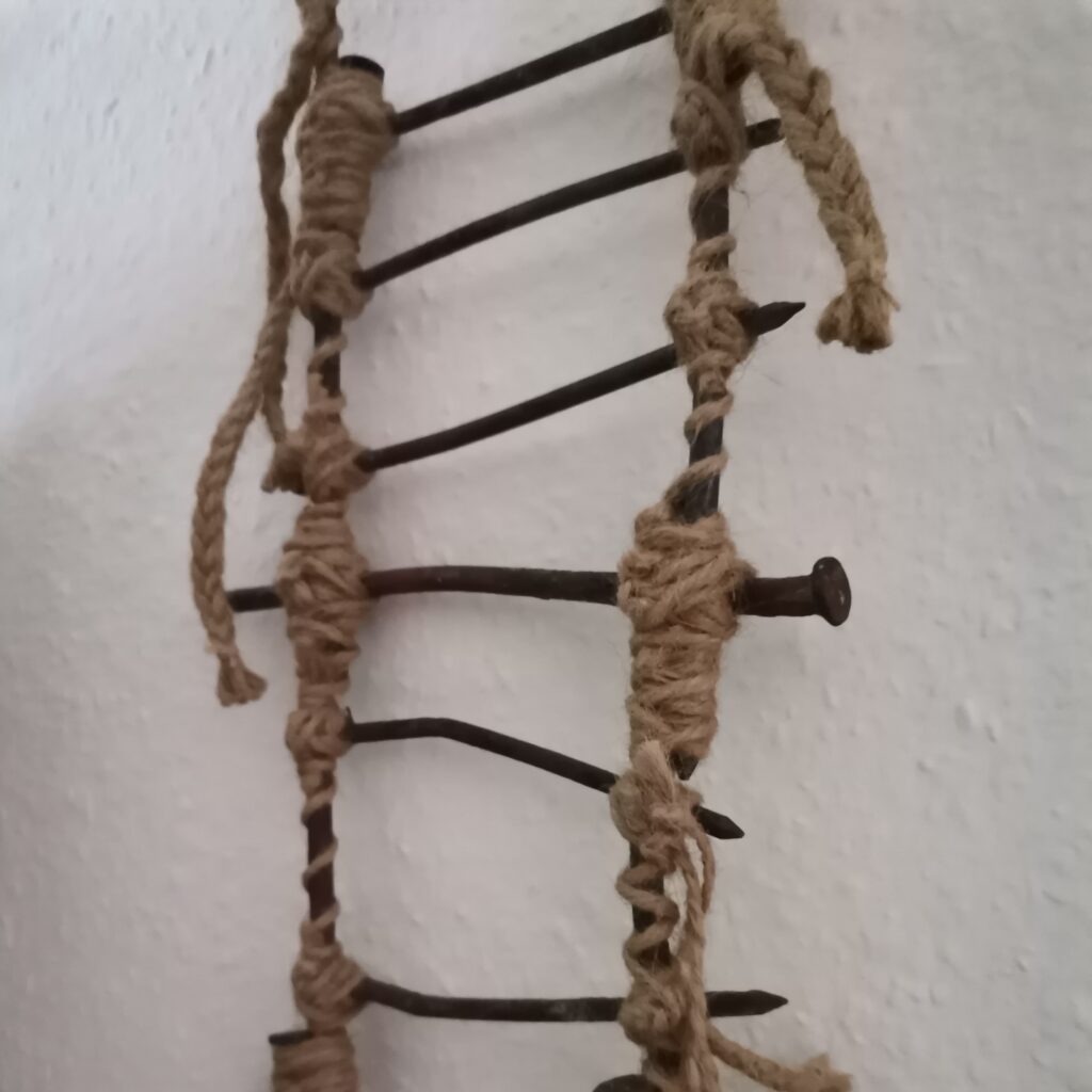 Mittig auf dem erdfarbenen Tuch steht ein Kessel mit Asche und drei Federn als Symbol der Erneuerung und Phönix-Kraft unserer Erde. Die Segensbänder sind sowohl in Form von Fotografien – als auch am Erdtuch liegend – Teil der Installation. Sie sind geflochten, geknotet oder gezwirbelt und geschmückt mit Naturmaterialien. Dazwischen ist Klaubholz ausgelegt, das mit Stoffstreifen umwickelt ist.